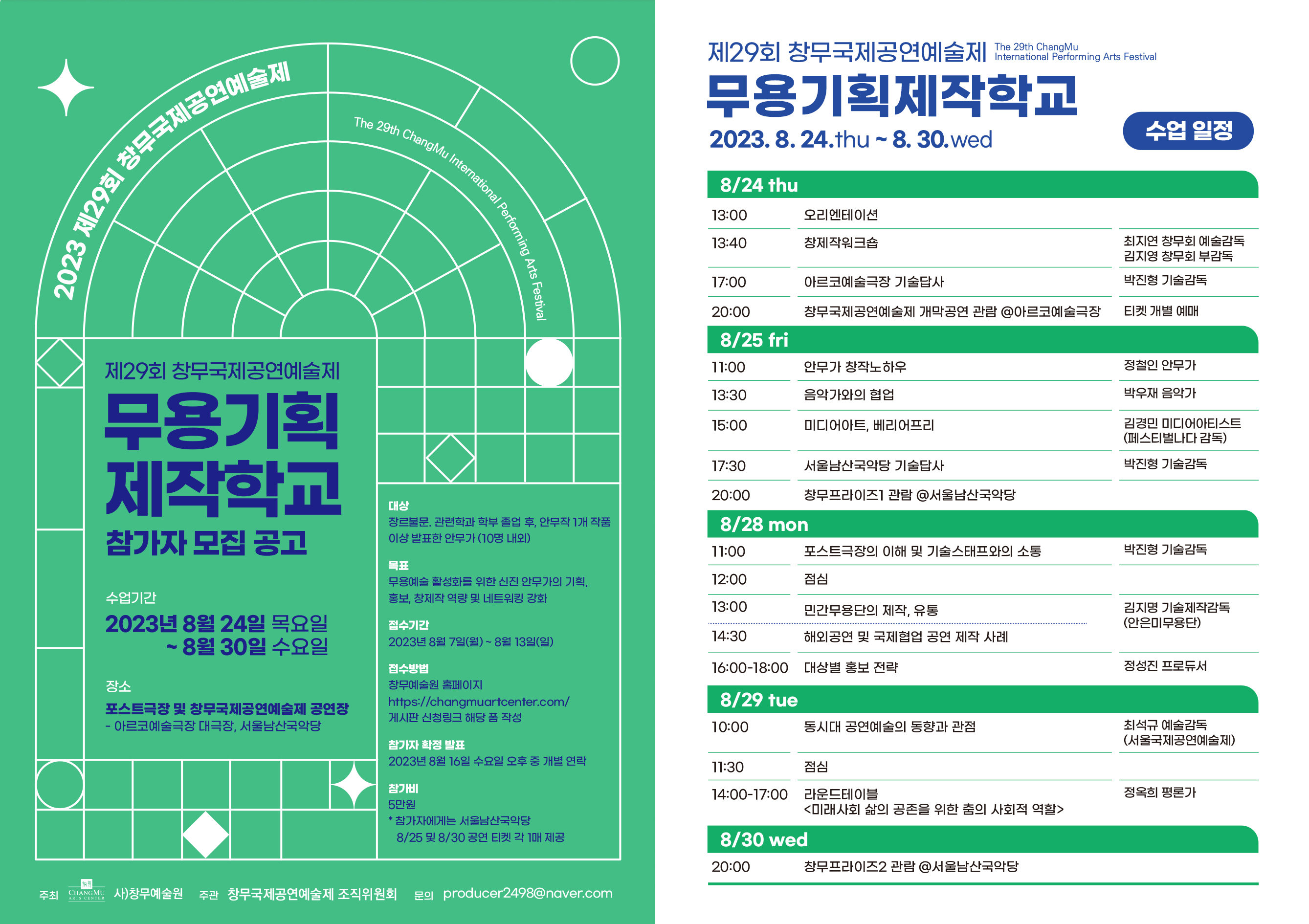 한편 창무예술원은 예술제 기간 중 신진 안무가를 위한 ‘창무기획제작학교’를 마련한다. 강사진은 창무회 최지연 예술감독, 김지영 부감독, 안무가 정철인, 안은미무용단 김지명 제작감독, 서울국제공연예술제 최석규 예술감독, 거문고 연주자이자, 前 국립극장 여우락 크리에이티브디렉터 박우재, 미디어아티스트이자 페스티벌 나다 김경민 예술감독, 박진형 기술감독, 정성진 프로듀서 등이다.