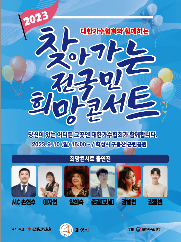 대한가수협회가 진행하는 ‘찾아가는 전 국민 희망콘서트’가 9월 10일 오후 3시 경기도 화성시 구봉산 근린공원에서 열린다.