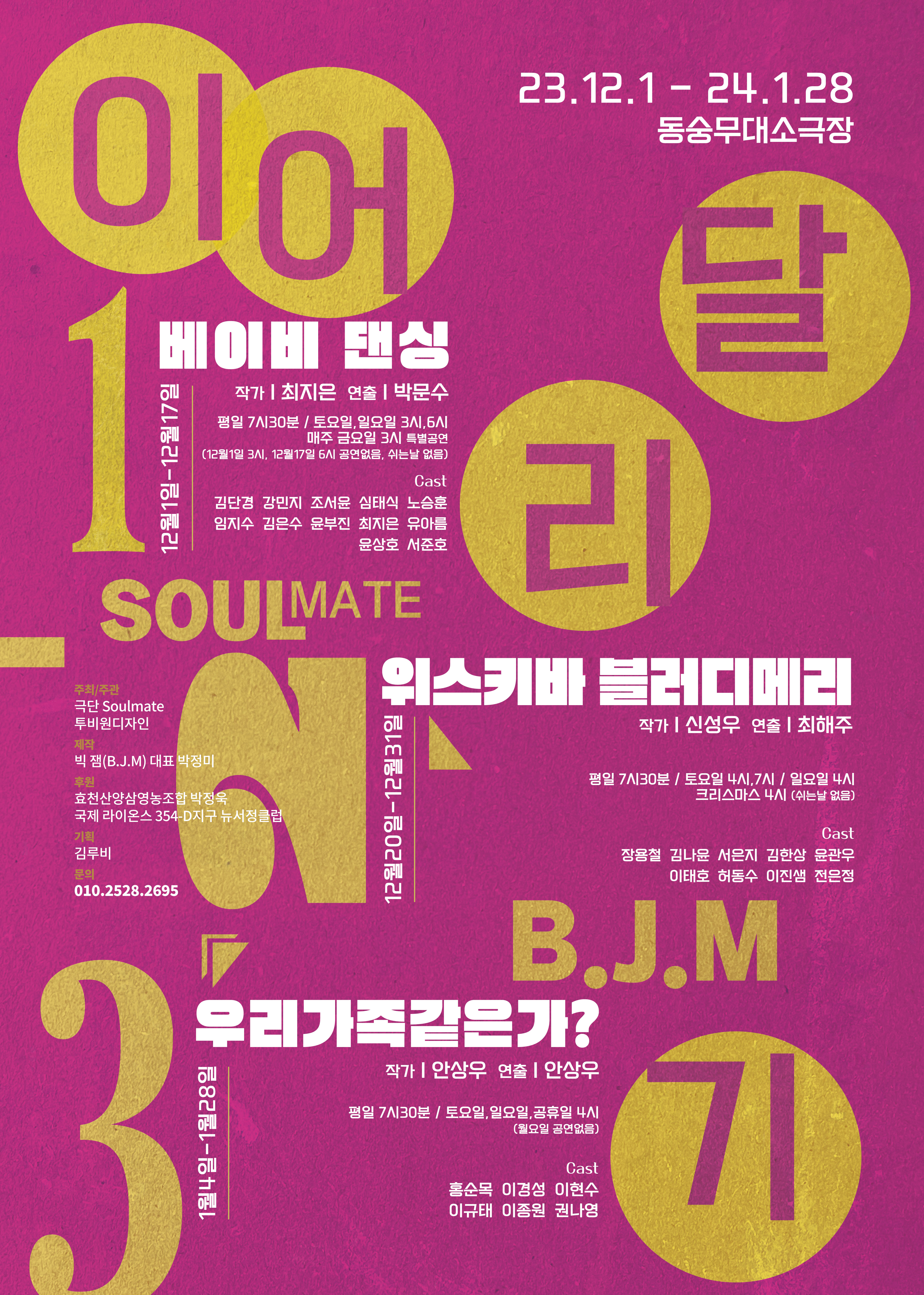연극 베이비 댄싱, 위스키바 블러디메리, 우리가족같은가?가 2023년 12월 1일부터 2024년 1월 28일까지 동숭무대소극장에서 잇따라 무대에 오른다.