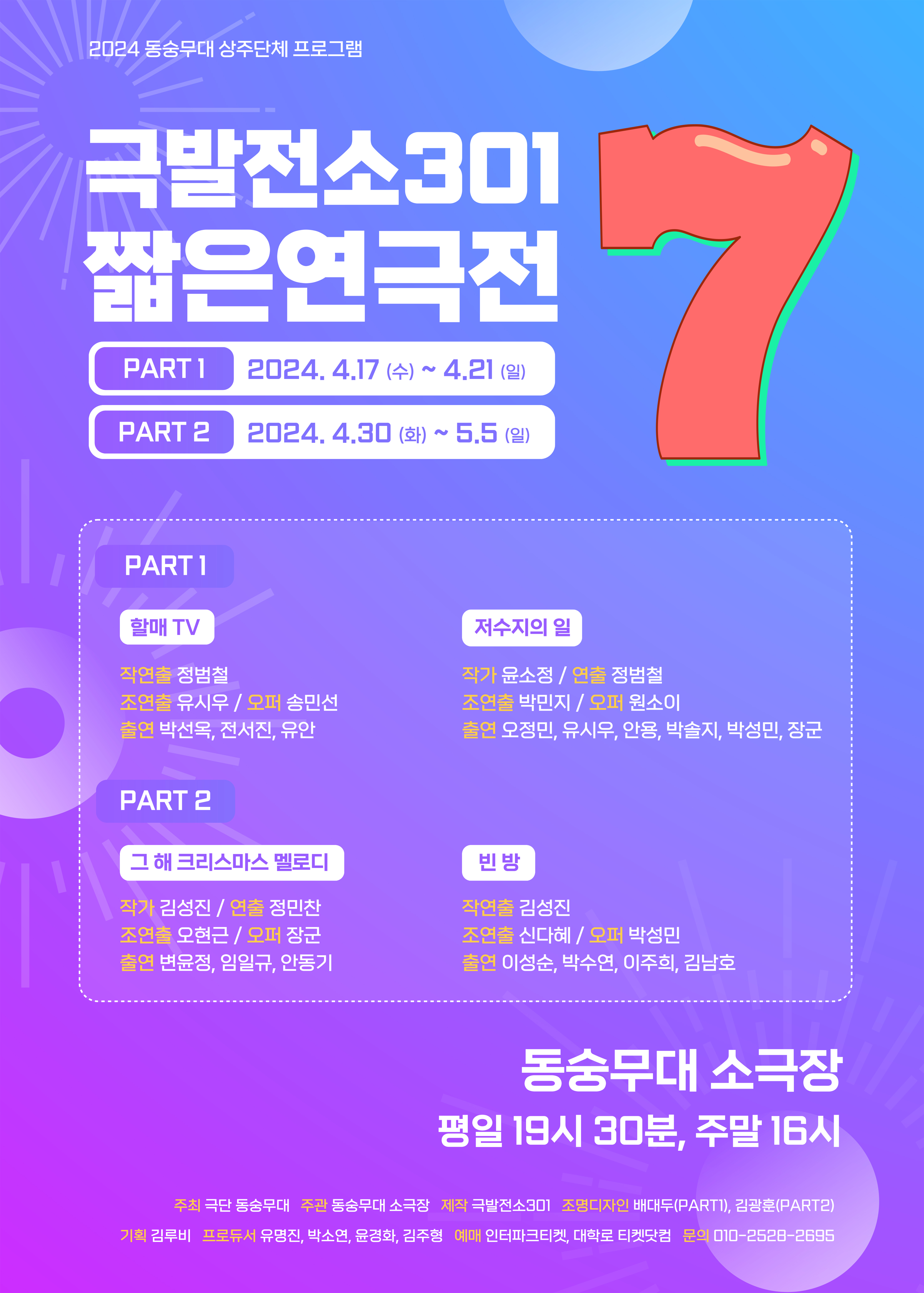 극발전소301의 단막극 연작 시리즈 ‘짧은연극전 7’이 4월 17일부터 5월 5일까지 동숭무대 소극장에서 열린다.