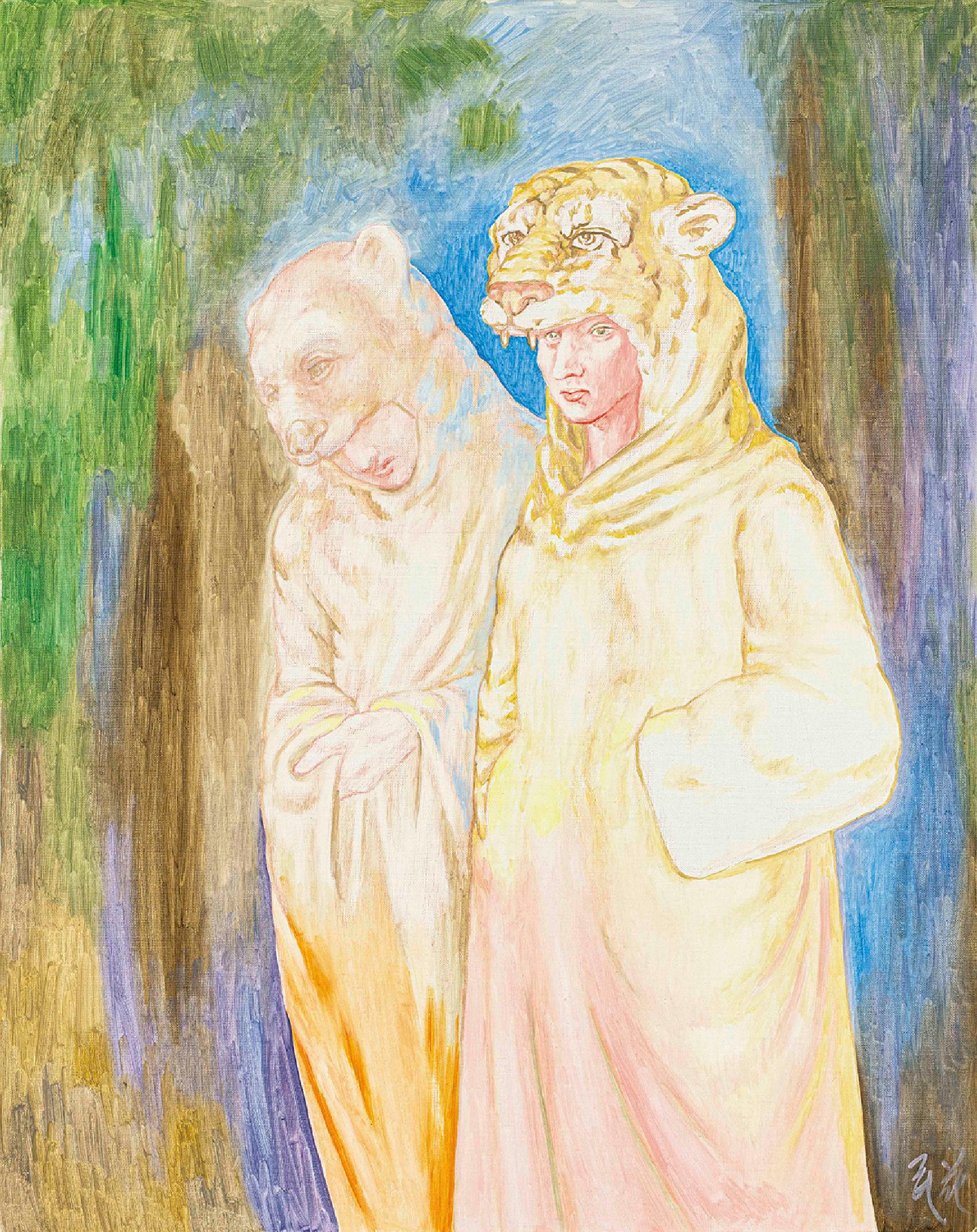 최민화 작가의 예스키스는 전작들과 분위기가 사뭇 달랐다. 컬러도 그랬지만 인물도 한국인의 골격이 아니었고, 구성도 이국적이고 고전적인 느낌을 줬다. 마치 인도나 물이 귀한 중동 지역의 사람을 그려놓은 것 같았다. 하지만 전시 제목은 ‘조선적인, 너무나 조선적인’으로 역설적이었다. 조선이 아닌데 너무나 조선 같다는 표현은 조선이 과거의 조선이 아니라는 것으로 읽혔다. 그림에 등장하는 인물, 동물, 사물과 다르게 배경만은 한국적으로 형상화한 것도 그런 의미겠다.