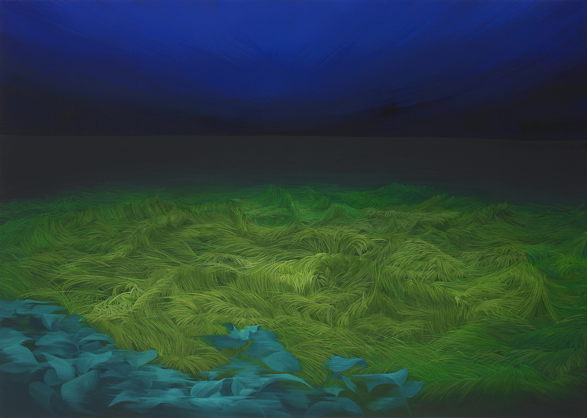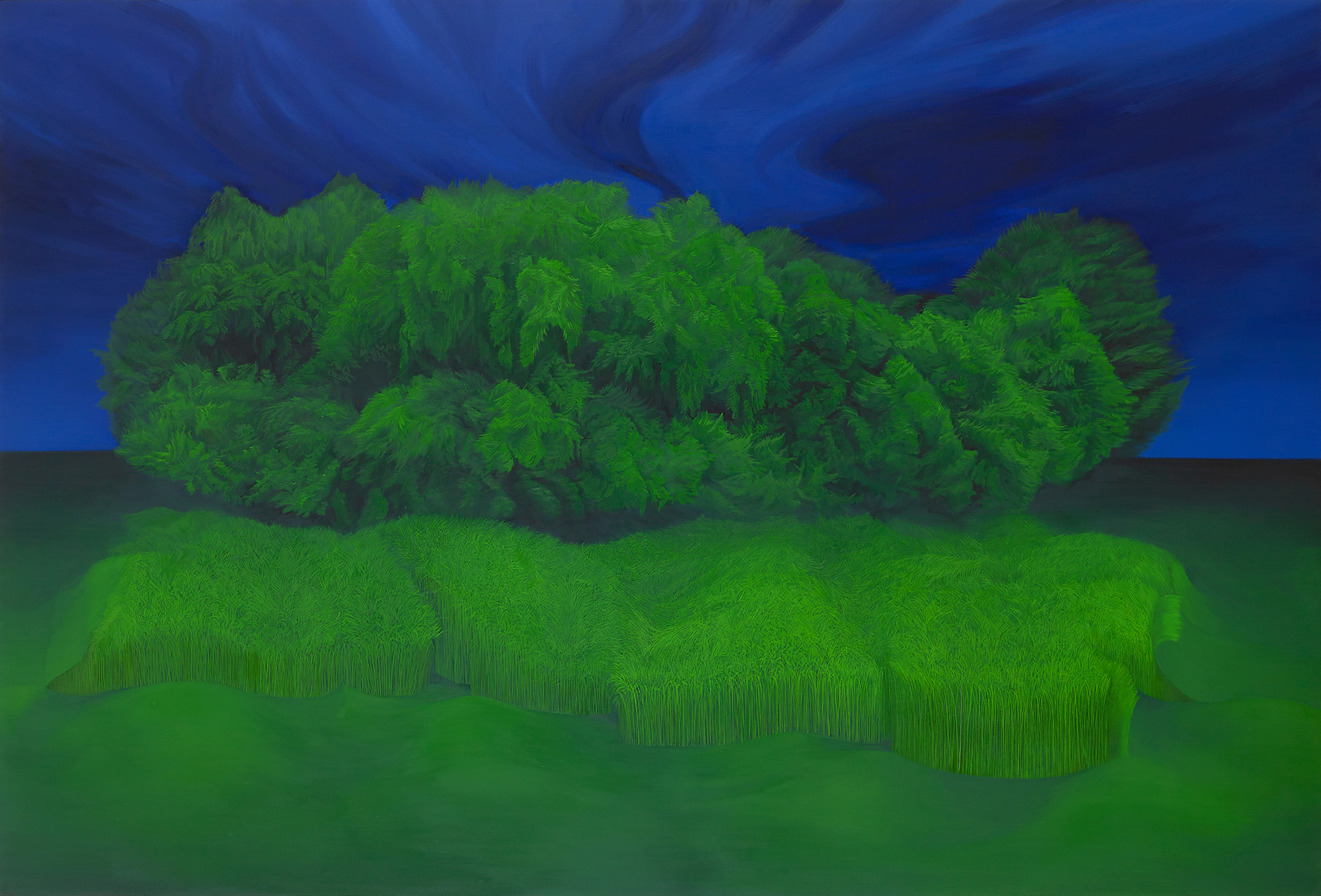 정선아 작가는 그림 그리는 행위에 커다란 행복을 부여한다. 따사로운 햇살이 뇌리쬐는 연둣빛 잎사귀와 시원스러운 바람에 움지적거리는 푸릇푸릇한 풀숲에서 진정한 마음의 평화를 바라는 염원이 느껴진다.