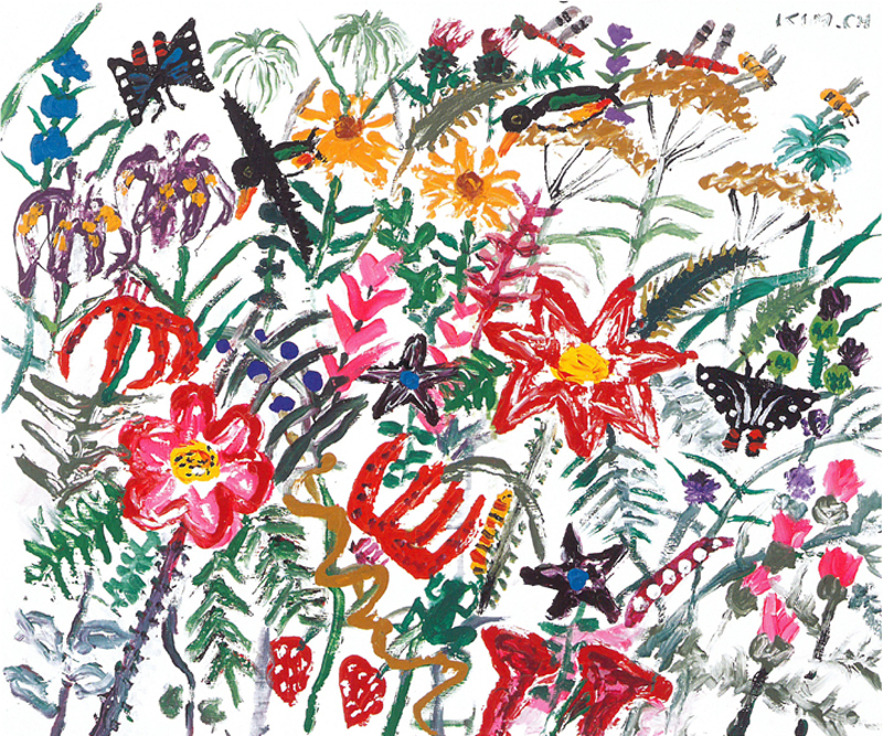 온갖 현란한 이미지들이 조화를 부린다. 투박하고 장난스럽게 보이지만 한결같이 남성적인 색채의 천태만상으로 자연의 원초적 생명력을 강렬하게 형상화한다.