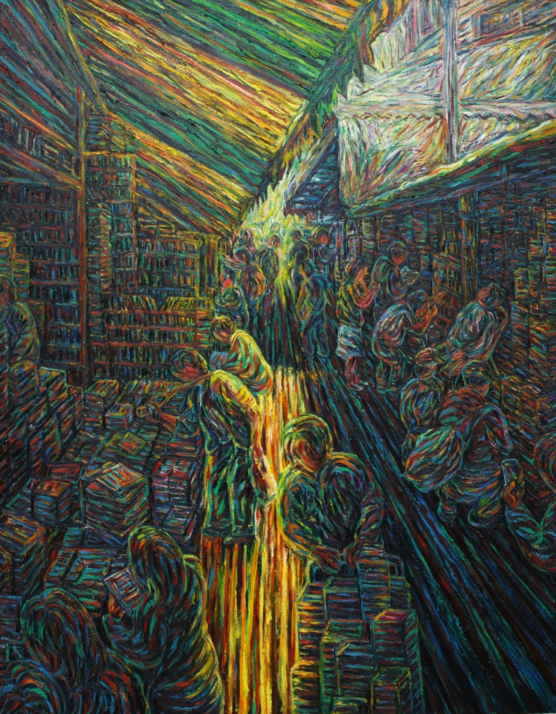 이민혁 화가는 서울의 일상적인 단면을 현란한 색채들이 난무하는 선으로 형상화한다. ‘사회적 갈등, 익명성과 존재, 끊임없이 가속화되는 경제개발과 상업주의의 팽배, 홈리스와 부랑자, 자살, 폭력, 그리고 유흥과 섹스에 탐닉하는 군중 속의 고독’ 등을 예리하게 포착한다.