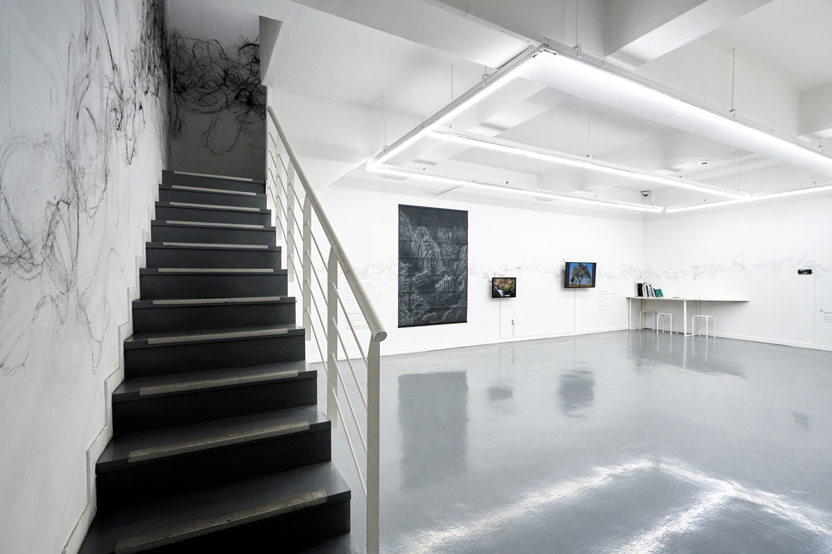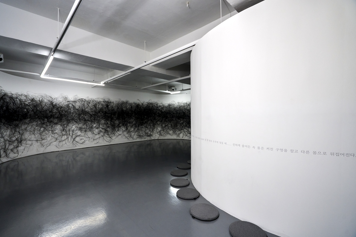 이번 전시에서 주목할 만한 작품은 43미터에 달하는 신작 ‘빛선소리’(2024)다. 전시장 1층부터 2층 나선형 구조물의 구석진 공간에 이르기까지 목탄 드로잉의 향연이 펼쳐진다.