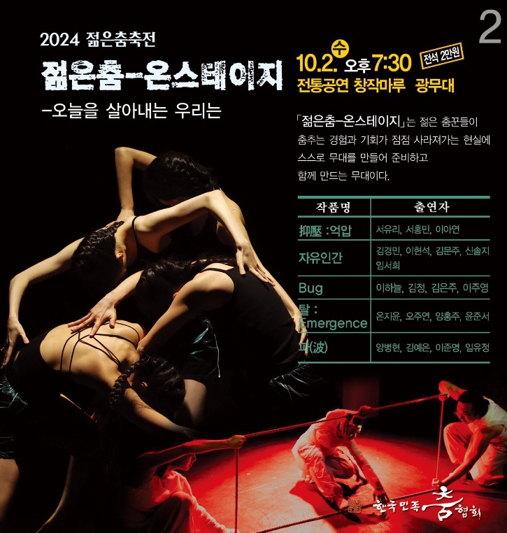 이번 축제에는 10월 2일 젊은춤-온스테이지, 4일 오늘춤 잇수다, 5일 아재들의 춤수다를 주제로 우리고유의 문화와 정신을 녹여낸 몸짓을 선보일 예정이다.