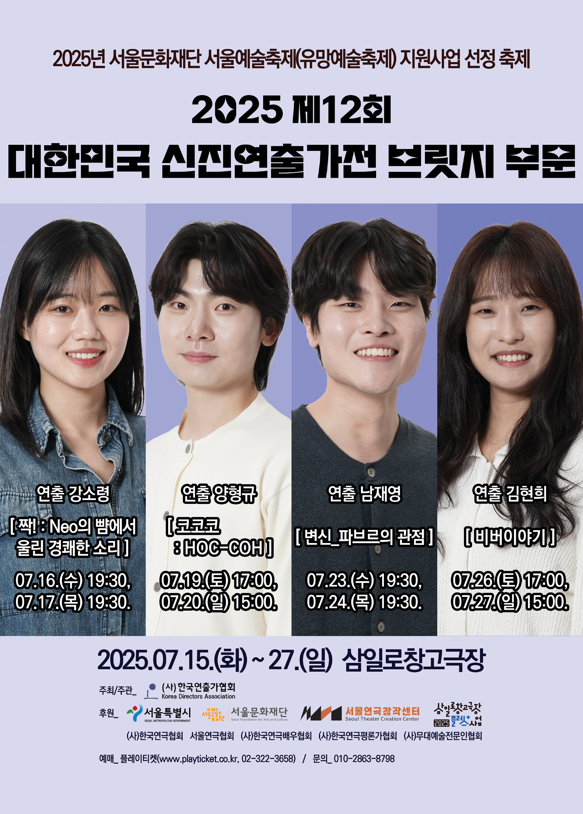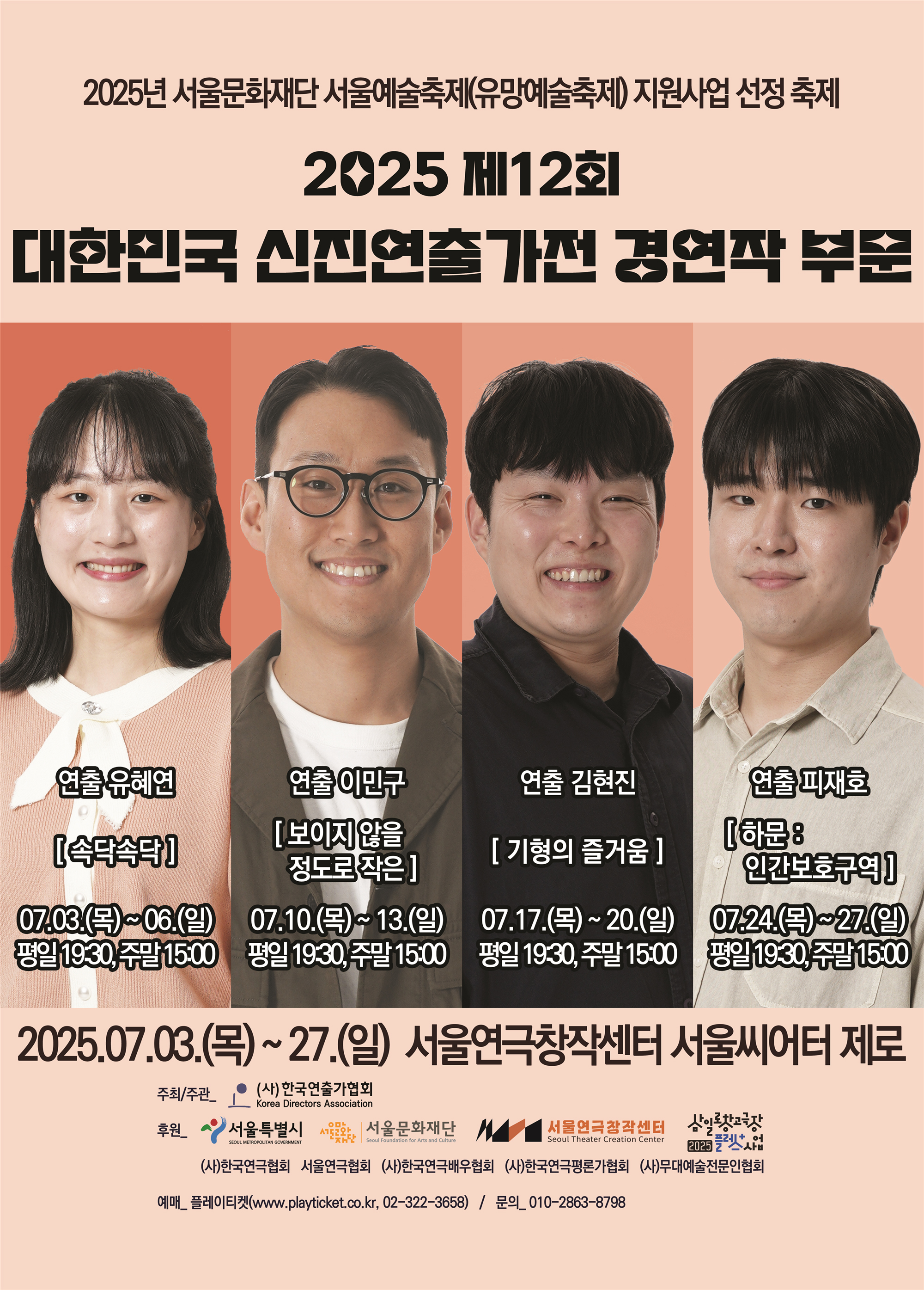 신진 연출가들이 지속적으로 작품 활동을 할 수 있도록 지원하는 ‘2025 제12회 대한민국 신진연출가전’이 7월 27일까지 ‘서울연극창작센터 서울씨어터 제로’와 ‘삼일로창고극장’에서 열린다.