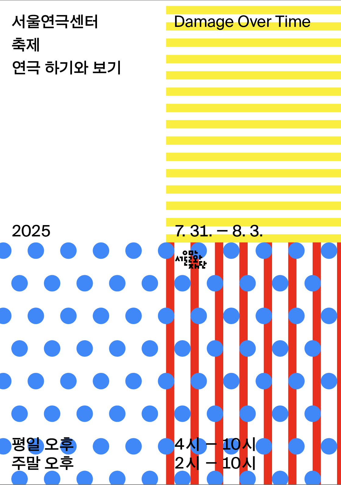 이번 축제는 ‘시간에 균열을 내는(damage over time)’을 주제로 서울연극센터라는 물리적 공간을 넘어 시간이라는 또 하나의 차원에 주목한다. 모든 층의 복도를 무대로 활용한 낭독공연부터 인근 야외 공간까지 센터 곳곳을 활용하는 이동형 공연, 옥상을 활용한 토크 콘서트 등이 준비된다.