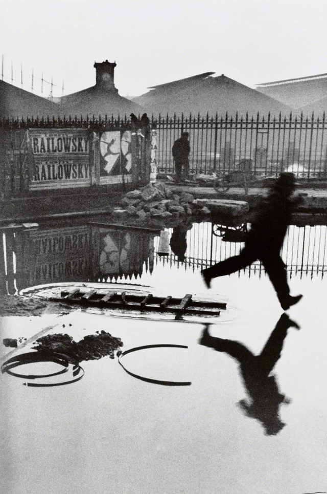 앙리 카르티에 브레송은 비가 내린 뒤 물이 고인 파리 생 라자르역에서 중절모를 쓴 한 남자가 고여있는 물웅덩이를 빠른 걸음으로 지나가기 위해 점프를 하는 순간을 놓치지 않았다. 이 남자의 모습은 수면에 반사된 그림자와 완벽한 대칭구조를 이루고, 뒤쪽 벽면의 포스터 속 무용수의 동작과도 대칭된다.
