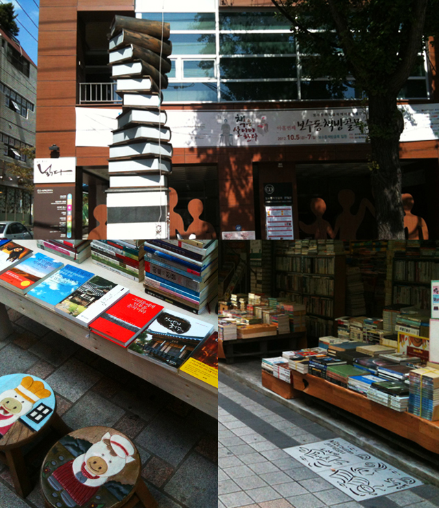 좁은 골목으로 들어가면 헌책방들이 즐비하다. 책들이 쌓여있어 그런지 골목에는 책 냄새가 꽉 차있었고, 서점 안에는 쉽게 구할 수 없는 옛날 책들을 구하러 온 사람들로 인산인해다. 새 책도 비교적 싼 가격에 팔기 때문에 수험서를 사러 온 학부모와 학생들도 제법 눈에 띈다.