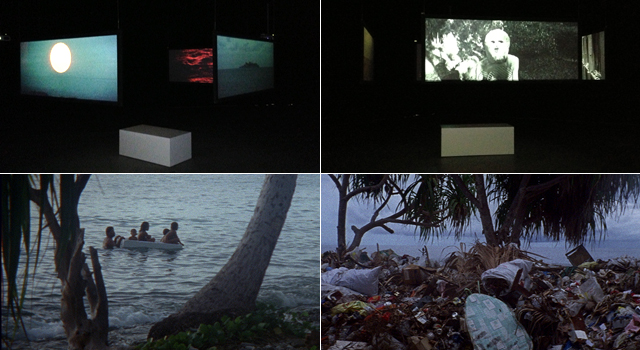 네 개의 영상이 보여주는 장소는 각기 달랐다. 대서양의 아프리카 서북구 부근 카나리제도의 스페인령 섬 란자로테, 일본의 나가사키 해안에 위치한 섬 군칸지마, 태평양 중남부에 위치한 섬 투발루, 그리고 영국의 서머셋이었다.