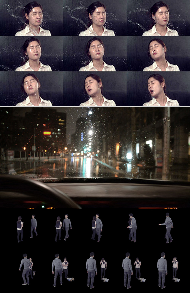 여자는 한 남자와 길을 걷다 부딪쳐 들고 있던 책들을 바닥에 떨어뜨린다. 또 여자의 얼굴은 갑자기 물을 뒤집어쓰고 망가져버린다. 뭔가 좋은 일이 벌어질 것 같은 예감이 들지만, 영상 이미지는 모두 다 슬로 모션이다. 슬로가 아니라면 볼 수 없는 이미지들이 계속해서 스쳐 지나가면서 현실을 투영한다. 거기에는 어떠한 꾸밈도 없다. 연출만 있을 뿐이다.