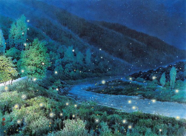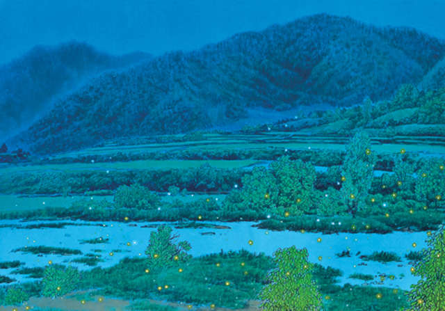 반딧불이가 노란 물감이 번진 것처럼, 하얀 물감이 퍼진 것처럼 캔버스를 날아다닌다. 수채화 같은 농담으로 신비로움을 자아낸다. 문재성 작가는 평면적인 산수화에 반딧불이를 점묘로 형상화했다. 이러한 표현법은 반딧불이를 원근감 있게 보여주며 작품에 대한 몰입도를 높인다.