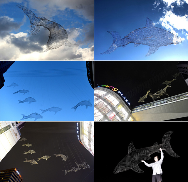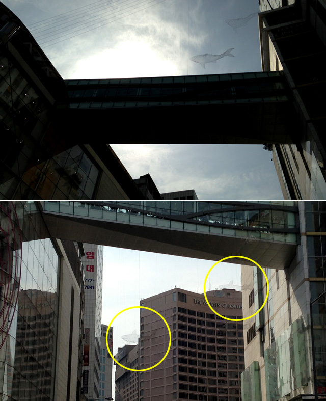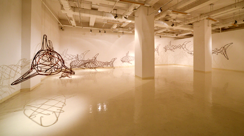 코로나19가 침습하지 않았을 때였다. 명동 거리를 걷다 에비뉴엘과 영플라자를 잇는 러브릿지에 상어들이 유영하는 모습을 봤다. 김창환 조각가가 스테인리스 스틸 철사로 만든 상어였다.
