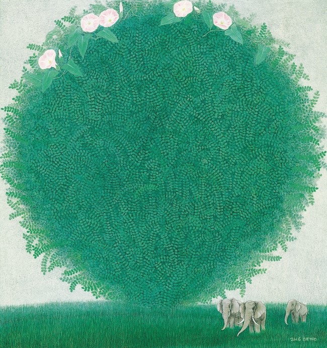 이해경 작가는 작품에 코끼리를 그려 넣었다. 풀과 나무보다 작은 코끼리들이 한가롭게 어울리는 모습이다. 코끼리는 세계에서 가장 큰 육상 동물이다. 무게도 수 톤에 달한다. 매일 300kg 이상의 풀과 나뭇가지, 뿌리와 열매, 100리터의 물을 먹어야 산다. 그래서 하루에 18~20시간을 먹는 데 보내는 동물이다. 이러한 동물이 초록빛 화면에 작게 들어가 있으니 너무도 행복해 보인다.