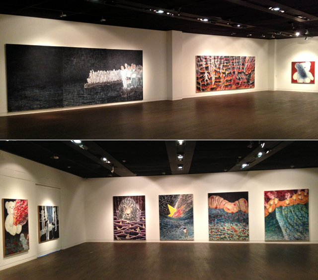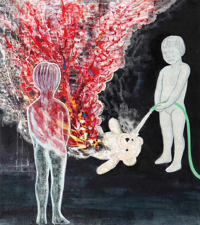 그래서일까. 그는 마냥 행복해 보이는 하얀 곰인형의 배에 불을 붙였다. 그 아래로는 화염병을 들고 있는 벌거벗은 남자가 보이고, 불이 점점 커지는 곰인형을 뚫어지게 바라보는 남자도 있다. 또 커다란 장지가 모두 불바다다. 산에도, 들에도, 집에도 모두 불이 붙었다. 한쪽 구석에는 어린아이가 울고 있고, 반대쪽에는 벌거벗은 어른이 헐레벌떡 도망간다. 최근 화제가 되고 있는 아동유괴사건의 영향을 많이 받은 것 같은 그림이다.