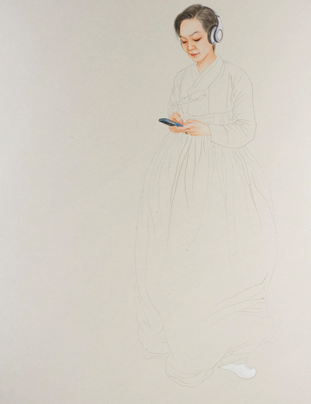 우아한 한복을 입은 여성이 스마트폰으로 바깥 세계와 소통한다. 이 욕구의 뿌리에는 ‘인간다움’이 있다. 혼자가 아니라 여럿에 대한 근원적 고독이 물씬 묻어난다. 진정한 ‘인간다움’을 사회로 치환해보면 혼자만 잘 먹고 잘 사는 것이 아니라 서로 소통하고 치유하면서 사는 것. 그 테두리의 넓이에 따라 인간다움은 깊어지고, 그 테두리 안에서 인간은 동질감을 느끼고 유연해진다.
