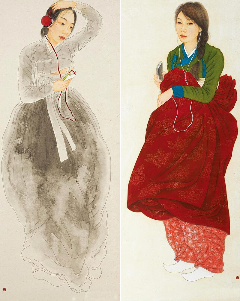 동양에서는 초상화를 그릴 때 가장 중시했던 가치가 ‘전신사조’였다. 인물의 형상을 그대로 재현하는 것이 아니라 눈과 표정 등 미묘한 감정선까지 그림에 담아내면서 인물의 정신을 표현하고자 노력했다. 이 작가의 미인도는 ‘전신사조’에 충실하다. 전형적이고 영구적인 미인도의 방식을 그대로 차용한다. 여인의 감정이 느껴지도록 오감의 감각을 오롯이 담아냈다. 또 아무렇게나 흘러내린 옷고름, 속살을 드러낸 실루엣, 풍성하게 부풀려진 속치마를 세세하게 묘사해 실재 그대로의 자연미를 더한다.