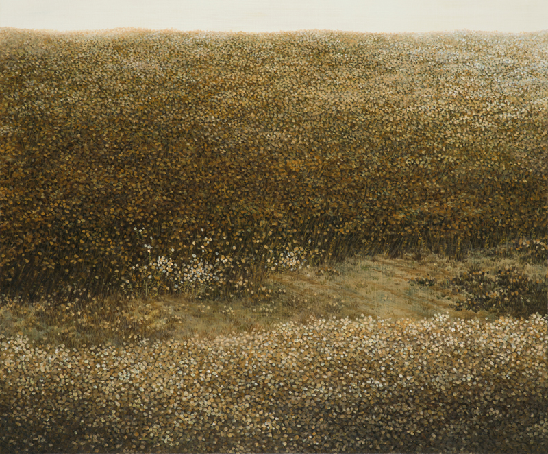 이도연 작가의 작업은 한마디로 공양이다. 평화로운 마음으로 붓을 들지 않으면 힘든 노동, 자연의 생명력과 경이로움에 깊게 매료되지 않으면 단 한 뼘도 그려내지 못할 그림이다. 자연의 현현(顯現)이 환희처럼 다가온다. 그녀는 작은 점과 가는 붓 터치의 작업을 통해 무한한 자연의 세계를 관조한다. 한 겹, 두 겹 캔버스를 덮는 반복적인 행위를 하면서 명상의 공간에 빠져들고, 자연의 무한함을 발견하면서 캔버스 채워 나간다.